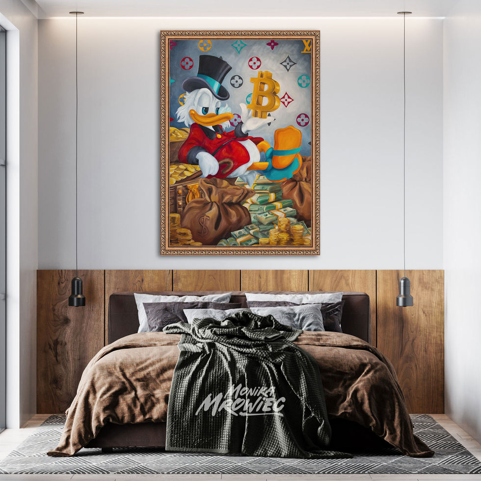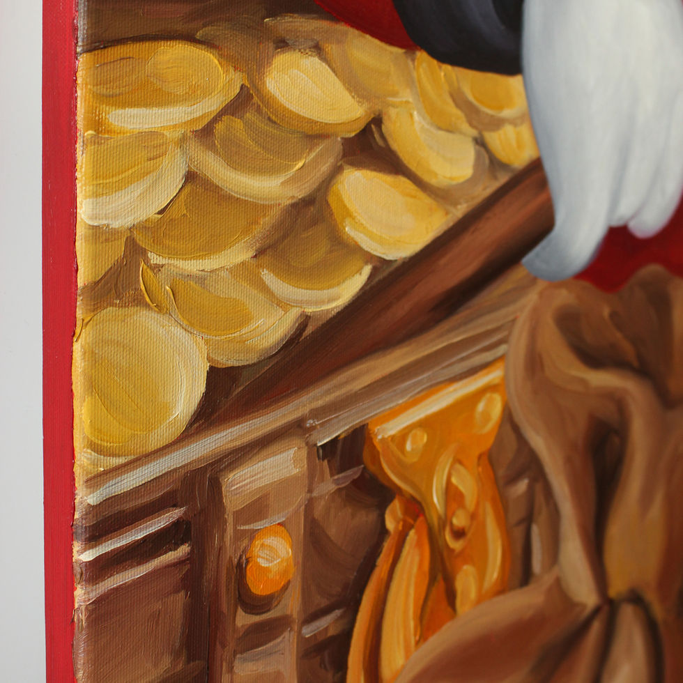 In the background, the walls of his vault are adorned with the luxurious Louis Vuitton pattern, emphasizing the splendor and wealth of his kingdom. This is the artist's first pop art painting created entirely with oils, which is not a typical choice for this particular style. The sides of the canvas are painted in a deep red, enhancing the rich ambiance of the illustration.