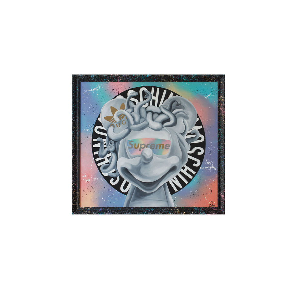 Super party portrait of Mickey Mouse character. Fashionable pattern with the Moschino brand, a badge of collaboration between Gucci and Adidas in golden gilding (lacquered). The reference to the mythical Medusa symbolizes the current trend for sculptures of her and the Versace brand. Supreme glasses with a unicorn effect, the surface reacts to light, strongly reflecting blue shine. A black matte decorative unique frame in a fun & glamour style is painted consistent with the background of the painting.